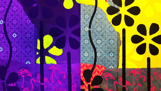 Kunst ei pea oleme alati tõsine. See on mängulust, kus värvide eriomadused loovad uusi tasandeid. Selles segatehnika töötoas me kombineerime nepaalipaberi mustreid šabloonimotiividega. Täiesti uuele tasandile viib tööd fluorentseeruvates toonides detailide lisamine, mis pimedas ruumis UV-valguses toovad esile peidetud salasõnumeid. Kasutame LB Flashe akrüül-vinüülvärve.